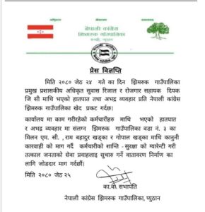 विहिवार निजामती कर्मचारी संगठन जिल्ला कार्यसमिति प्यूठानले विज्ञप्ति निकालेकाे छ।