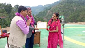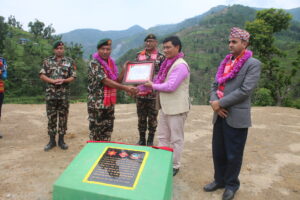 हेलिप्याड निर्माणमा प्राबिधिक सहयाेग गरेकाेमा बर्द बहादुर गणका गणपति प्रमुख सेनानि रमेस थापा लगाएत निशुल्क जग्गा उपलब्ध गराउने स्थानिय जग्गादाताहरुलाई धन्यवाद दिदै प्रशंसापत्र प्रदान गर्नु भएकाे छ।