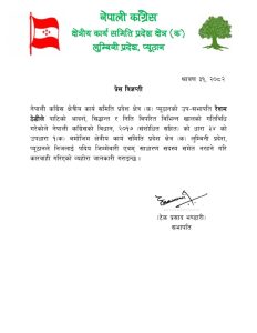 प्यूठान । नेपाली कांग्रेस क्षेत्रीय कार्य समिति प्रदेश क्षेत्र (क) प्यूठानका उपसभापति रेशम ढेडिलाई पार्टीको आदर्श, सिद्धान्त र नीतिविपरीत गतिविधि गरेको भन्दै पद तथा साधारण सदस्यताबाट कारबाही गरिएको छ।